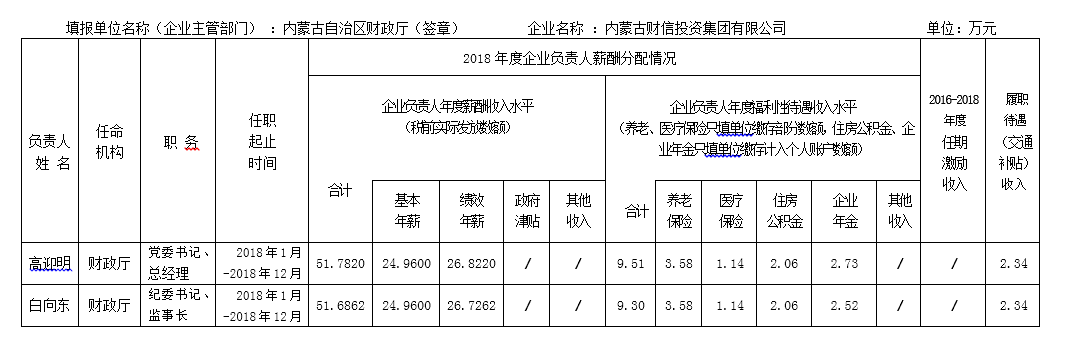 2018年度內蒙古自治區直屬國有企業負責人薪酬信息公開披露表
