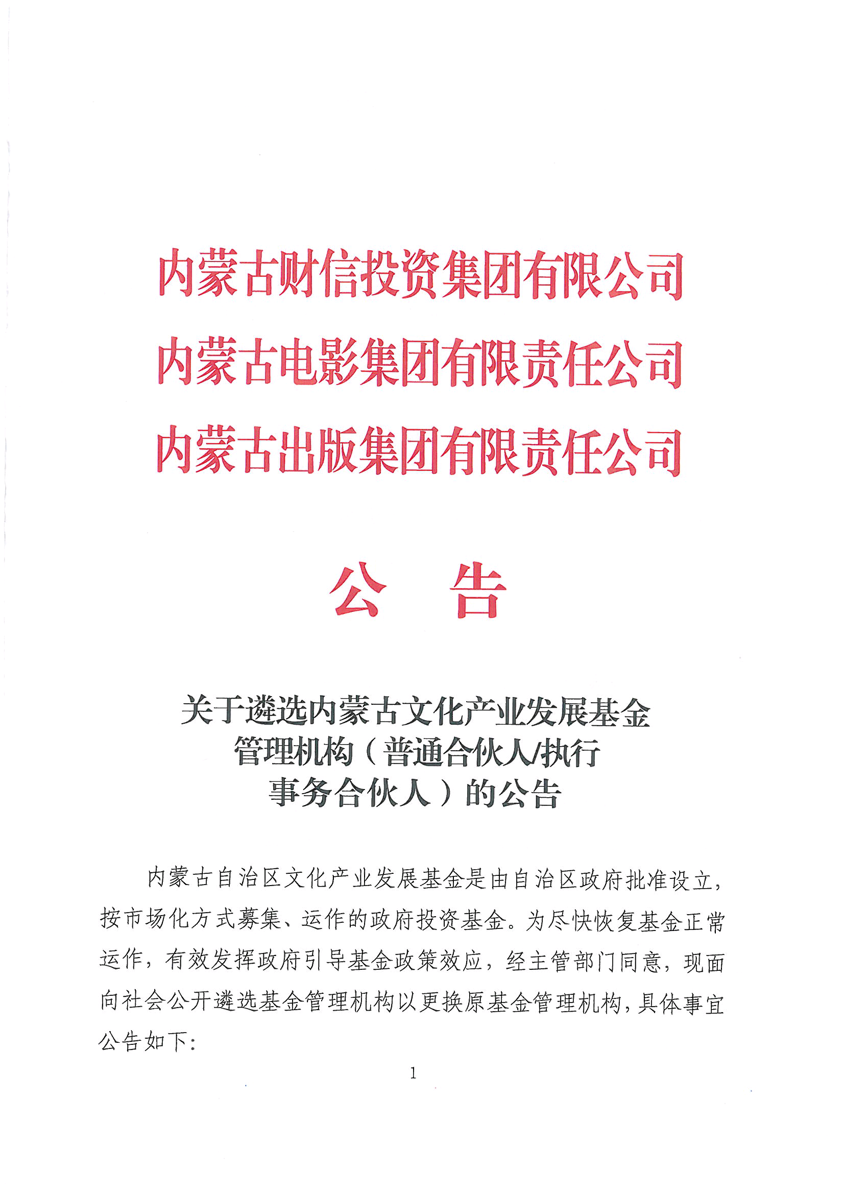 關于遴選內蒙古文化產業發展基金管理機構(普通合伙人/執行事務合伙人)的公告