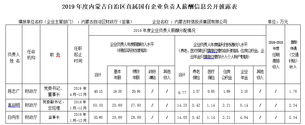 2019年度內蒙古自治區直屬國有企業負責人薪酬信息公開披露表