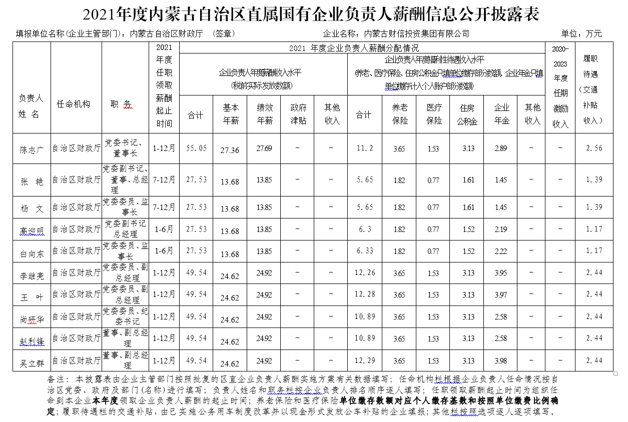 2021年度內蒙古自治區直屬國有企業負責人薪酬信息公開披露表